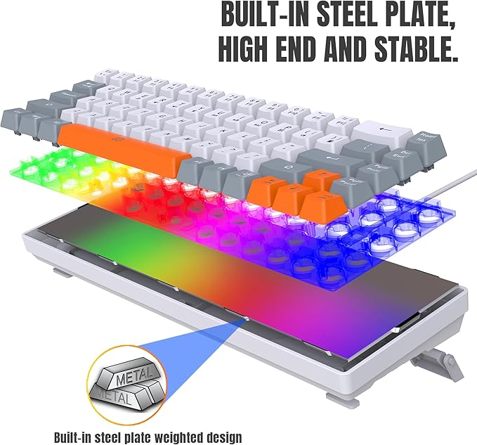 Snpurdiri 60% Wireless Gaming Keyboard and Mouse Combo,Rainbow Backlit Rechargeable 2000mAh Battery,Mini Mechanical Feel Keyboard +Popular RGB Mice for Gaming,Business Office(Gray-White-Orange)
