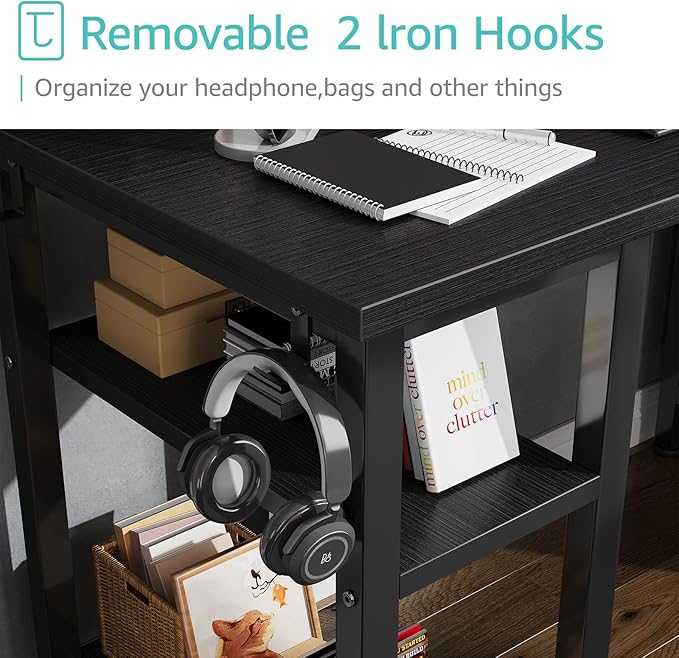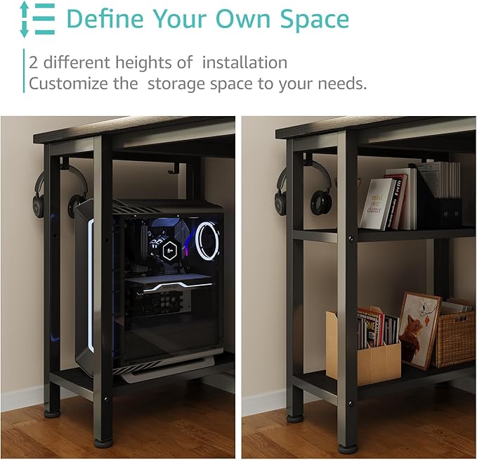 - Working Desk With Ample Storage Options: Computer desk with 2 storage shelves and 4 ππππ§ππ πΏπ§ππ¬ππ§π¨ with wooden front, you can try this two installation methods (left or right), and the shelves have two different heights of installation, you can customize the storage space to your needs. It also have 2 iron hooks, perfect for holding magazines, notebooks, bags or small electronics