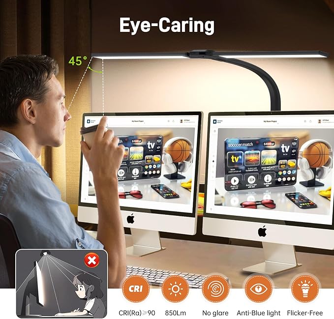 - 【Adjustable Lamp & Wide Application】The LED strip is 90° horizontally adjustable, making it ideal for L-shaped tables or scenarios where dual monitors are used. It can also be used as a sidelight when the heads are lined up together for bright, targeted desktop lighting. This is very suitable for large workbenches with wide curved monitors or dual monitors, drafting desks, and architect desks, allowing you to have a good lighting environment when working, reading, studying, drawing and crafting.