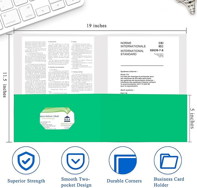 - Professional Design:Two pockets provide storage space for paper,brochures,and more,Each folders for documents measures 9" x 11.5",with two 5" pockets,holds (over 100) sheets of paper,and has a universal business card holder on the right pocket.