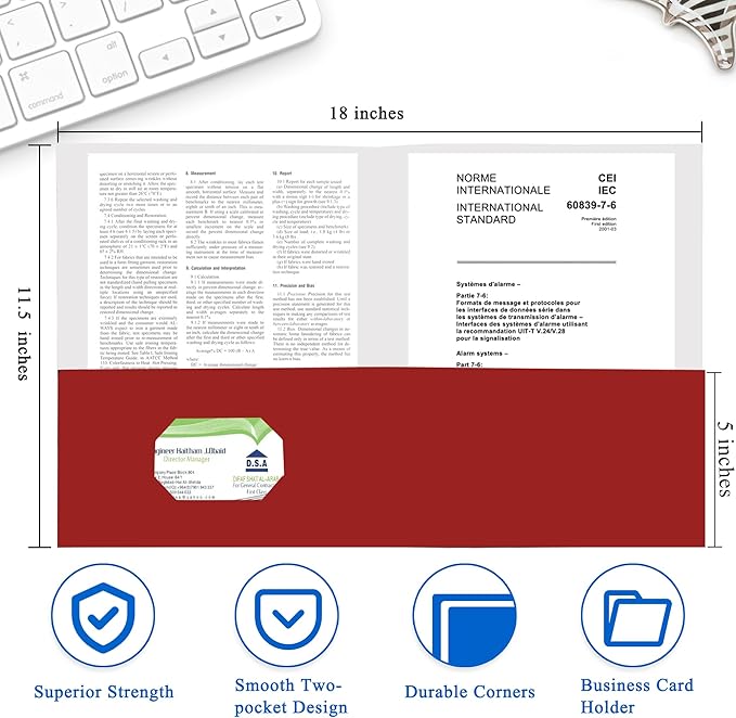 - Professional Design:Two pockets provide storage space for paper,brochures,and more,Each folders for documents measures 9" x 11.5",with two 5" pockets,holds (over 100) sheets of paper,and has a universal business card holder on the right pocket.