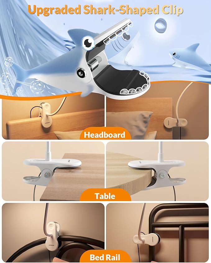 - Preset Night Light: Simply press a button, and the clip light provides you with a private night glow. The clip lamp lets you get up at night without darkness