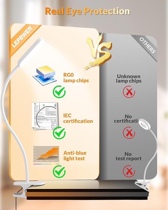 - True Eye-caring: 0 blue light hazard, no flicker, and high CRI≥93. Lepower book lights for reading takes care of your eyes during daily use and surely causes no eyestrain or fatigue