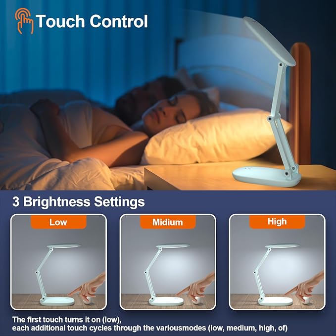 - 【SAVE SPACE, TOUCH CONTROL, 2-FOLD SUPPORT FRAME IS HIGHER】Led desk lamp can be adjusted freely in multiple angles, foldable, convenient for storage, light in body, easy to carry, used in office, library and bedroom, white simplicity.You need to use the original charging cable to power the lamp and control it through touch buttons, you can use the touch button panel to control the light switch and brightness. Please note: This light requires a 5V-1A plug for power.