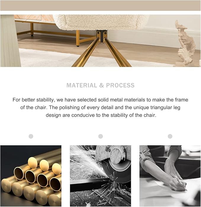 - Stable & Durable – Built with a sturdy gold metal frame and soft boucle upholstery, this vanity chair offers both durability and comfort. The reinforced lower base provides greater stability and supports up to 350 lbs. Each leg features a gold aluminum base with non-slip natural rubber feet to prevent scratches and sliding.