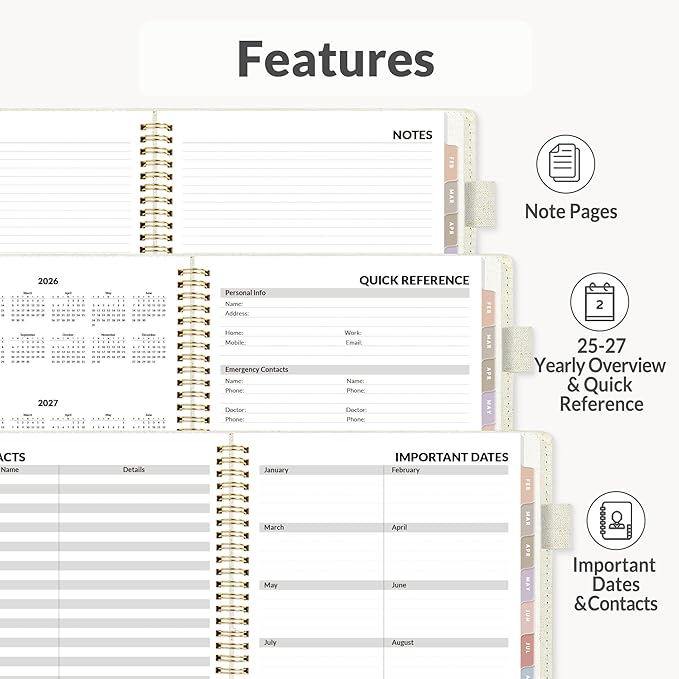 - Additional Features - The weekly planner includes 2026-2028 calendars, year schedule for full year 2026, holiday lists, contact pages, notes pages, important dates, and US time zone map. Beautiful monthly tabs simplify navigation and add a stylish, playful element to the planner's aesthetic.