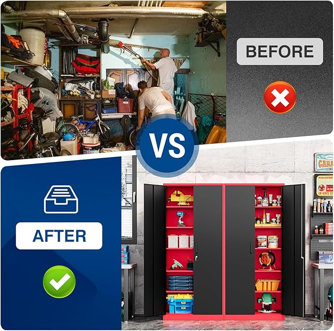 - Adjustable Shelf Height- The Metal Storage Cabinet has 5 adjustable partitions to accommodate items of different heights such as books, toys, kitchen supplies, toiletries, and garage tools. Suitable for garage, bathroom, kitchen, living room, study, office, as a storage cabinet. Use internal space more reasonably.