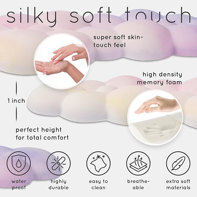 - Cloud Soft Comfort – The new rainbow cloud wrist rest by Create-ables prioritizes comfort and quality. The outer material of the cloud mouse pad with wrist rest is milk-silk – a soft, luxurious and biodegradable fabric that is similar in texture to silk and cashmere. Milk-silk is skin-friendly (unlike PU leather made from oil and chemicals) and more durable than most other fabrics