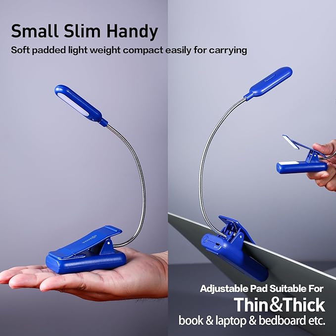 - 【7 Led & 9 Color Temperature】This new pretty royal blue book light is perfect for everyone which can increase their reading enthusiasm. Meantime, parents will also love the book lights when working, reading or accompany their kids. The reading light is equipped with 7 upgraded smd leds, 9 different color temperature modes: warm white(2800k/3000k/3200k), warm cool white(4000k/4500k/5000k) and cool white(6000k/6500k/7000k)