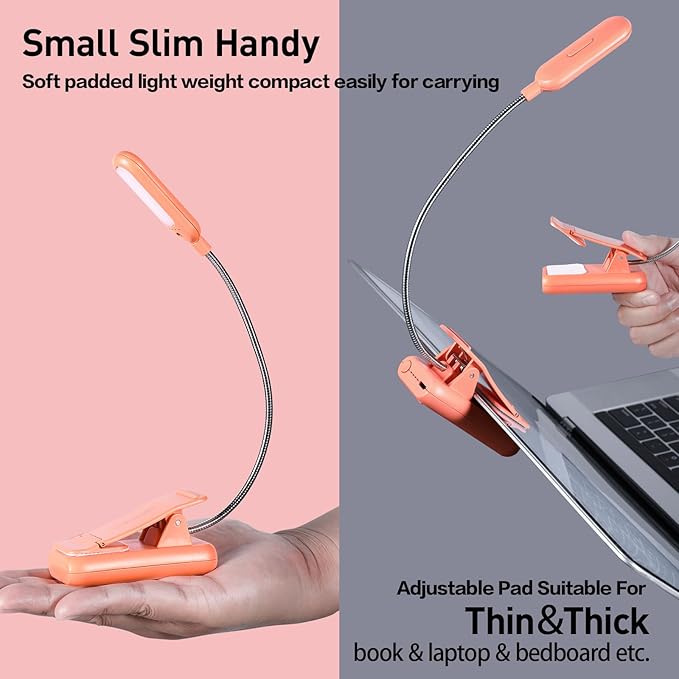 - 【7 Led & 9 Color Temperature】This new pretty orange book light is perfect for everyone which can increase their reading enthusiasm. Meantime, parents will also love the book lights when working, reading or accompany their kids. The reading light is equipped with 7 upgraded smd leds, 9 different color temperature modes: warm white(2800k/3000k/3200k), warm cool white(4000k/4500k/5000k) and cool white(6000k/6500k/7000k)