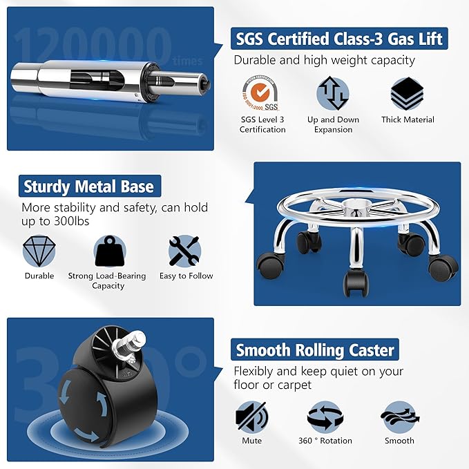 - Genuine Leather Seating: The round rolling stool seat cushion is wrapped in quality PU leather, waterproof, and oil-resistant. Filled with soft high-density memory foam, it provides a comfortable sitting experience for long periods and is easy to maintain and clean