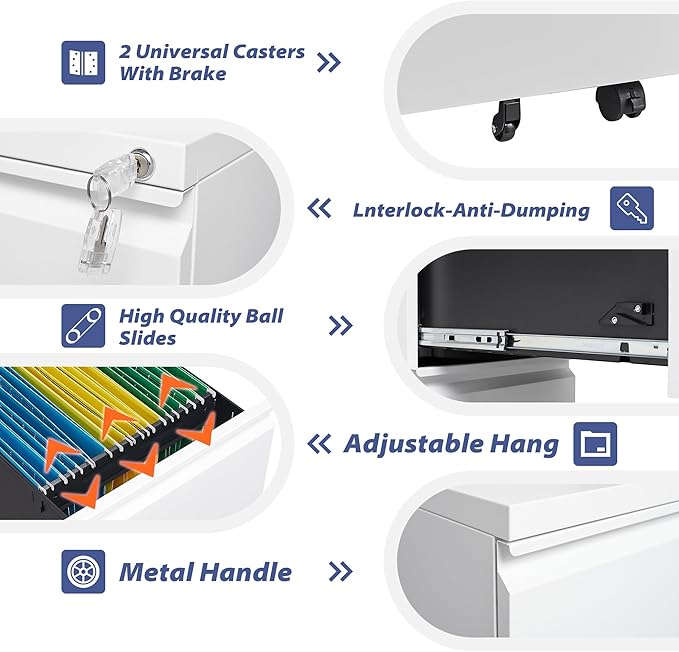 - 【Interlocking System】:The anti-tilt device allows only one drawer to be opened at a time, preventing the filing cabinet with lock from tipping forward. Furthermore, our under desk filing cabinet is equipped with a central lock, which can secure all drawers with just one key, adding an extra layer of security to your home or office.