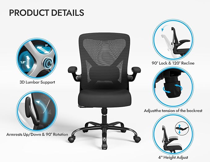 - Ergonomic Office Chair: Experience unparalleled support with our ergonomic office chair, designed to provide comprehensive assistance for your back, hips, and arms. Tailored lumbar support ensures your comfort and well-being. Suitable for people of about 5'5" to 6'2". Easily adjust seat height, backrest, and flip-up arms to cater to diverse needs, offering comfortable support during extended periods of sitting