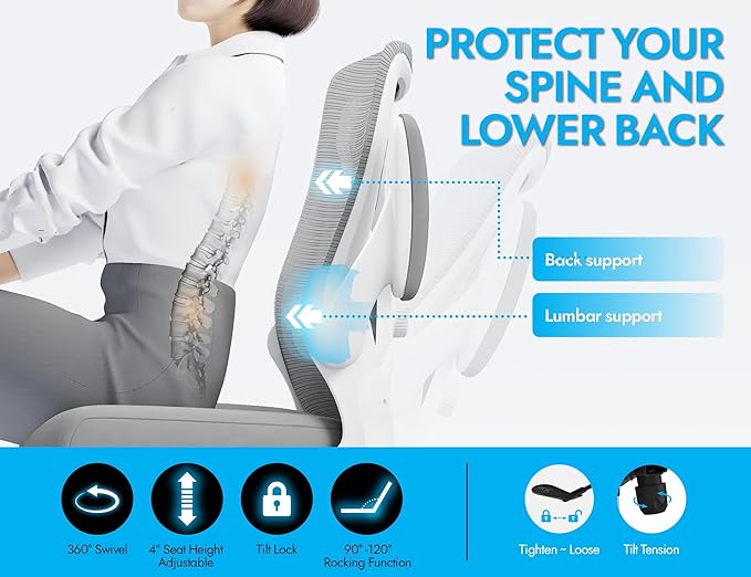 Ergonomic Office Chair - X-Shaped Computer Desk Chairs Comfy, Mesh High-Back Gaming Chair with Adjustable Lumbar Support, Executive Task Chair for Adults, Comfortable for Long Hours (White Grey)