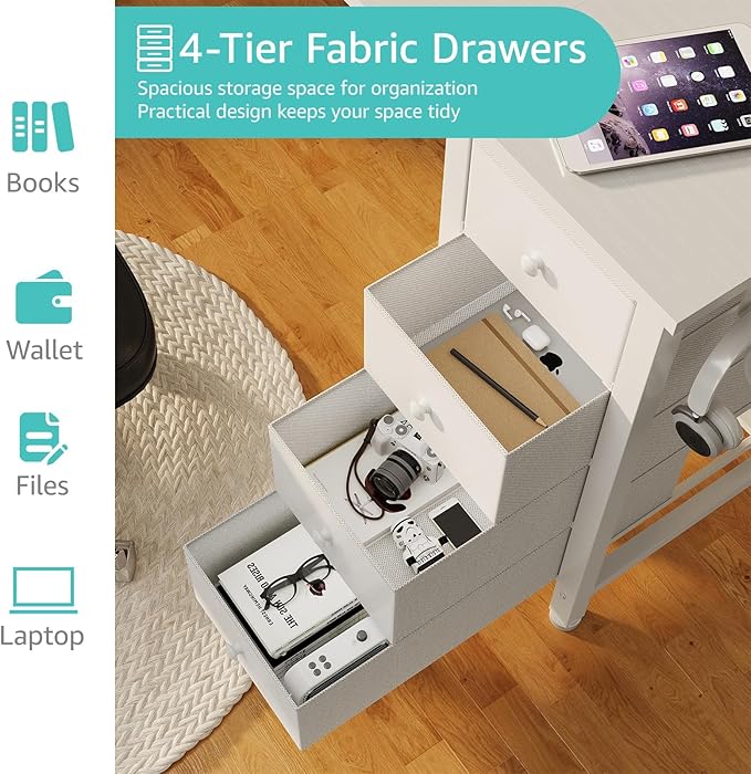 Lufeiya White Computer Desk with Fabric Drawers & Storage Shelves, 63 Inch Study Work Writing Desk for Home Office Bedroom, Simple Modern Cute PC Desks Table, White