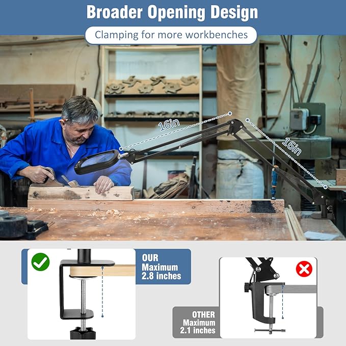 - Enhanced 2.6" Clamp Magnifier: Our magnifying lamp comes with a large clamp that extends to 2.6", offering a wider clamping distance compared to the standard 2.1" clips. Its clip securely fastens to various tabletop surfaces, accommodating both thick desks and narrow tables, ensuring stability in any setting. Whether you’re using it at home, in an office, in a studio, or a workshop, this carefully designed magnifier lamp enables you to work confidently and comfortably.