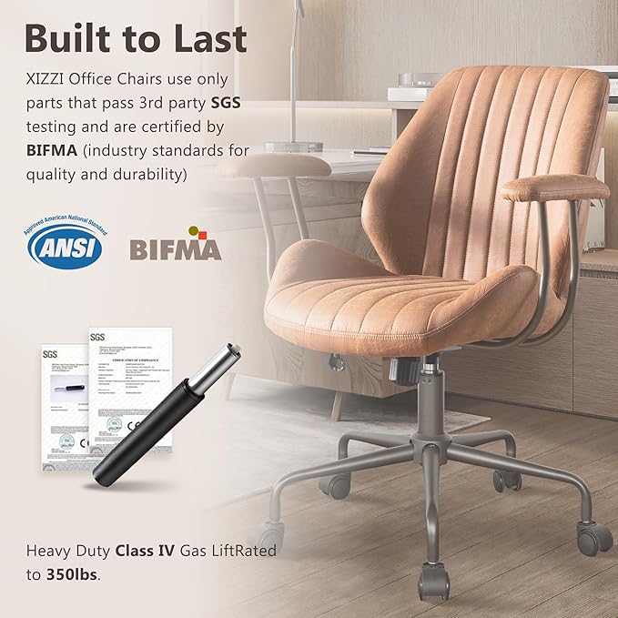 Mid Century Modren Office Chair - Mid Back Swivel Executive Chair with Lumbar Support,Ergonomic Computer Desk Chair with Wheels,Faux Lether Suede Task Chair,350lbs (Brown, Mid Back)