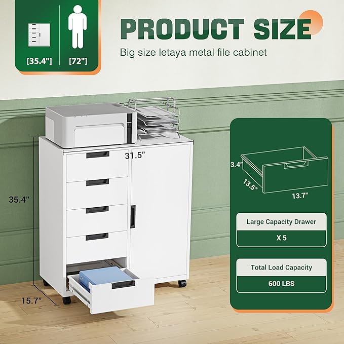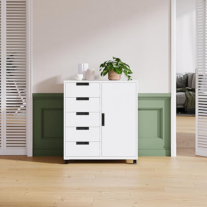 Letaya 5 Drawer Storage Cabinet, Mobile Printer Stand for Home Office,Dresser Chest with Shelves and Door(White)