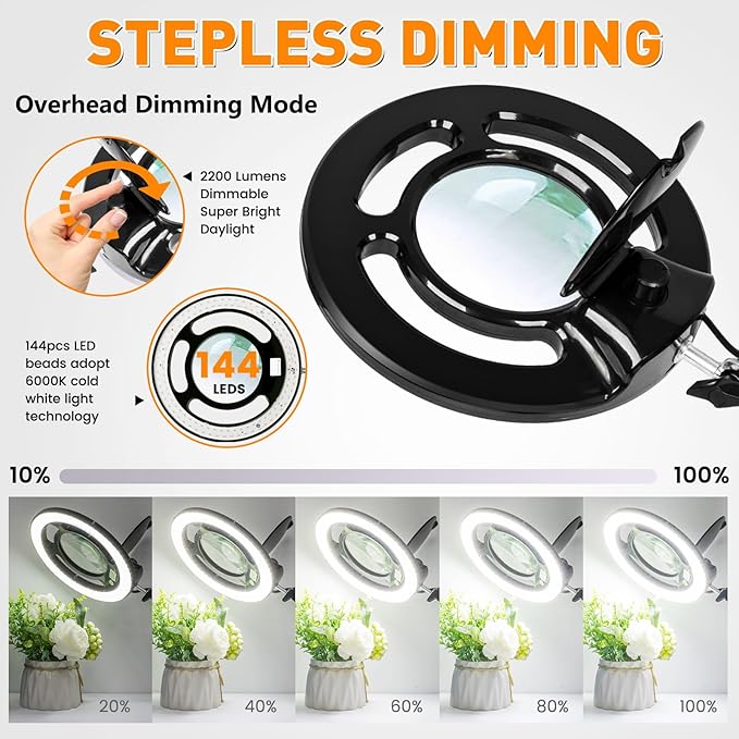 - 2200 Lumen High Brightness: 144 LED lamp beads embedded around the glass lens, 6000k cold white LED technology, and 24W/110 ~220V DC source make the brightness of this magnifying glass with light and stand reach 2200 lumen without flicker. Side-emitting technology ensures a wide light dispersion that brings you a high-brightness visual experience. The rotary switch design provides any brightness you want