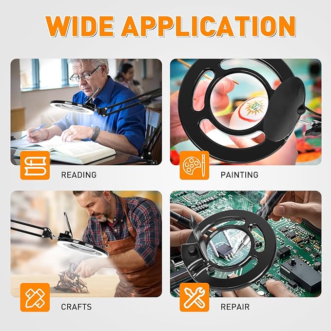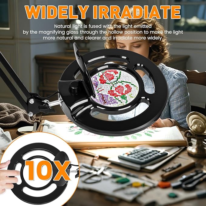 - 10X Real Optical Glass and Clear Without Distortion: This craft lights with magnifier is up to 1000% and its lens diameter is 4.2 inches providing real, clear, undistorted comfort for fine work. Ideal for reading, crafts, repair, sewing, painting, nails, cross-stitching, and more, it helps alleviate the struggles of aging eyes