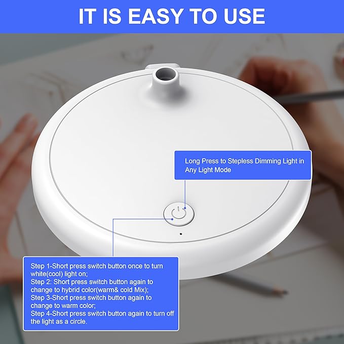 - 【Adjustable Brightness and Color Temperature】 This dimmable desk light offers 3 brightness levels and 3 color temperatures (4200K-4600K). You can easily choose a variety of lights for painting, reading, writing, kindle reading lighting needs. easily adjust the brightness by touch. Cool white lighting great suit for working, studying, reading.