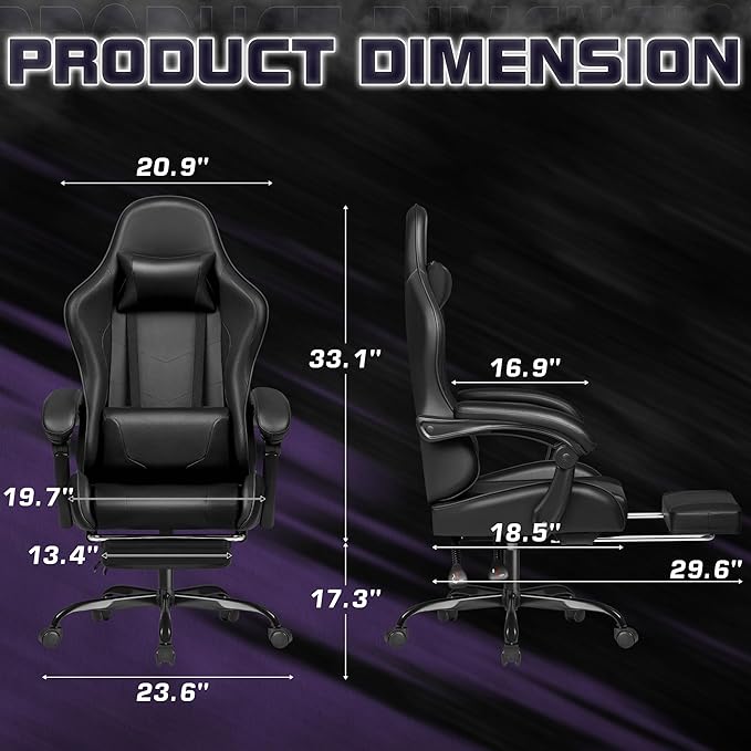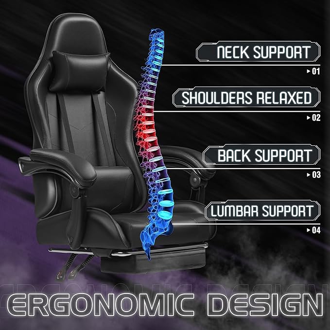 - Ergonomic Design: Gaming or working with head down for a long time make you feel tired? Or would you like a chair to make your gaming life more fantastic? Our gaming chairs are your choice. Equipped with flexible headrest and massage lumbar pillow, when you feel sore, you can rest assured to lean back, it will provide you with a comfortable neck support and an excellent back massage.