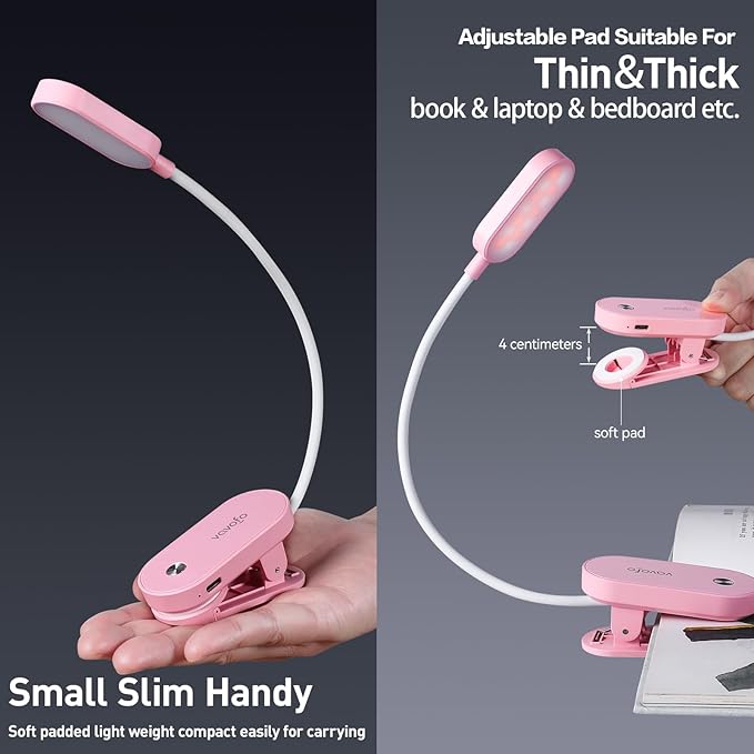 - 【360°Flexible Goose Neck & Non-slip Clip Design】- The Vavofo's reading light has the 360 degree adjustable neck with multi use non-slip clip which allows you to position the light exactly where you need it, creating the perfect private reading space for you while reading in bed, in college dorm, or on a plane, train, or bus. It can also be placed on the tabletop, work surface, etc. The book light is lightweight, portable, & travelling-friendly.