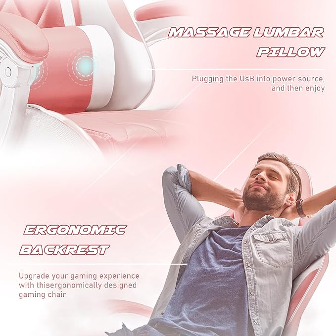 - Excellent Comfort: This computer gaming chair features headrest and massage lumbar pillow. When your neck gets sore from long hours working or gaming, the headrest can help ease the pain. When your waist feels achy from sitting in a same position, open the massage function of the lumbar support and let it relieve your fatigue.