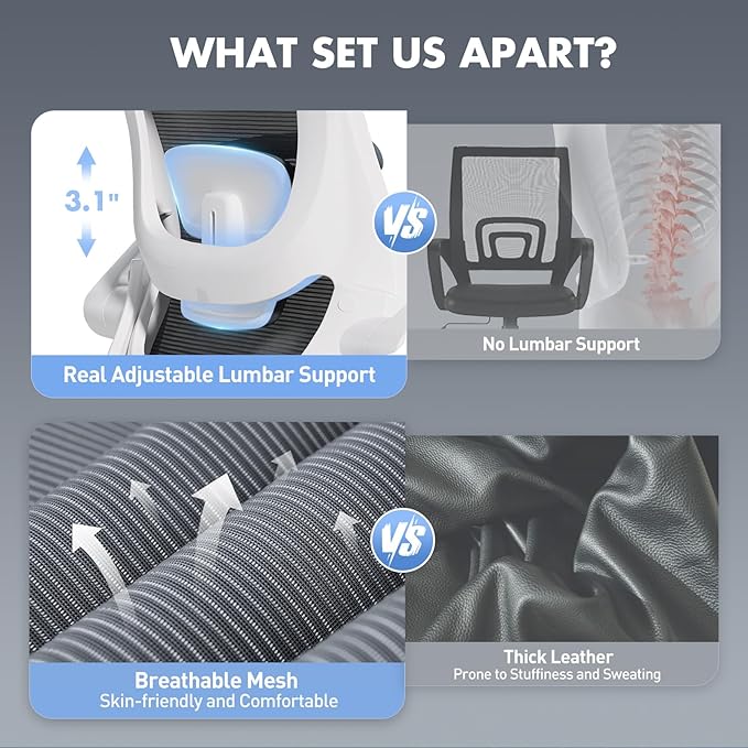 - 2. FULLY ADJUSTABLE LUMBAR SUPPORT FOR BACK PAIN RELIEF:Say goodbye to lower back pain with our ergonomic chair that offers fully adjustable lumbar support. The curved backrest aligns your spine, reducing strain and ensuring you sit comfortably for hours. You can easily adjust the lumbar height to tailor the support to your individual needs, providing relief from chronic back pain. Perfect for home office chairs and ergonomic desk chairs, this feature ensures you maintain healthy posture while boosting your comfort.