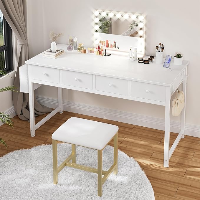 Lufeiya 47 Inch White Computer Desk with Fabric Drawers for Home Office Bedroom, Vanity Desk with Drawer Storage and Side Pouch, Study Writing Table, White