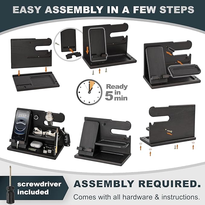- SMART DESIGN: The stand is easy to assemble (assembly manual attached) and сompatible with all kinds of smartphones; The stand also has compartments for wallets, documents, glasses, watches, fitness trackers, bracelets, keys, stationary, etc