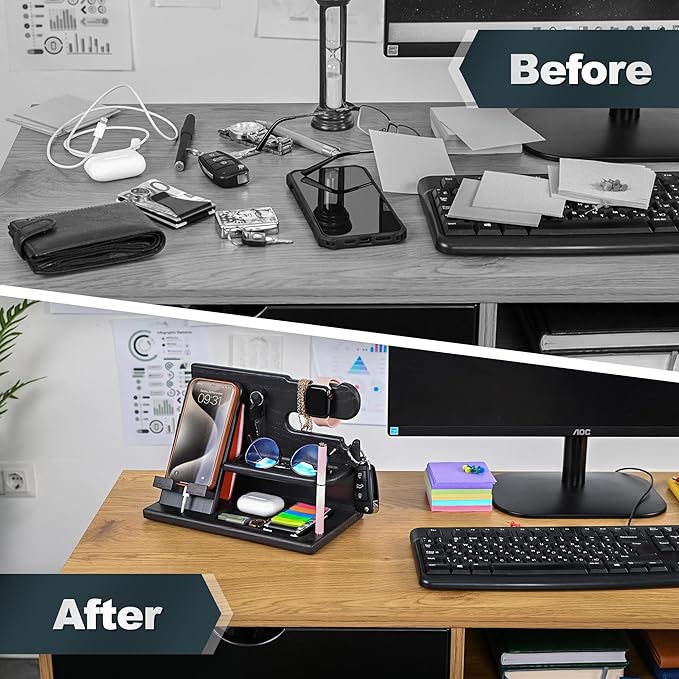 - MULTIFUNCTIONAL CHARGING STATION & ORGANIZER: Charge your cell phone and keep your daily-used things at hand; size assembled 5.9x10.4x7.4". Please note, the accessories shown in the pictures are not included