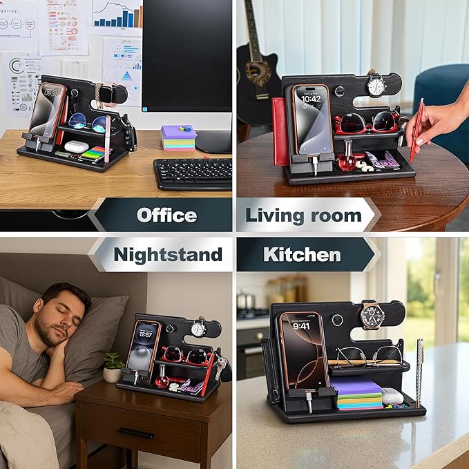 TESLYAR Wood Phone Docking Station for Men - Desk or Nightstand Organizer - Birthday Gifts for Husband or Dad - Anniversary Idea from Wife - Key Holder - Stand Wallet, Watch & Essentials (Deep Black)