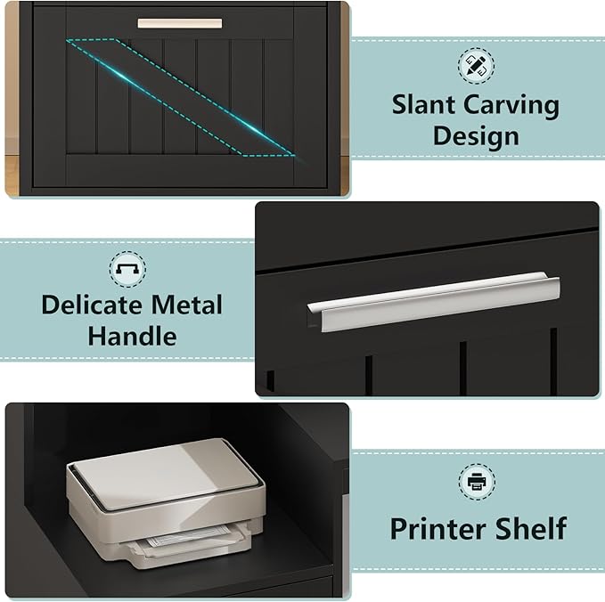 - [FARMHOUSE STYLE]: Designed with an elegant slanted carved finish on drawer faces with chic metal handles, this desk elevates your workspace with its unique style while ensuring practicality, adding a touch of a homey and rustic farmhouse aesthetic to a variety of settings, such as offices, bedrooms, and study rooms