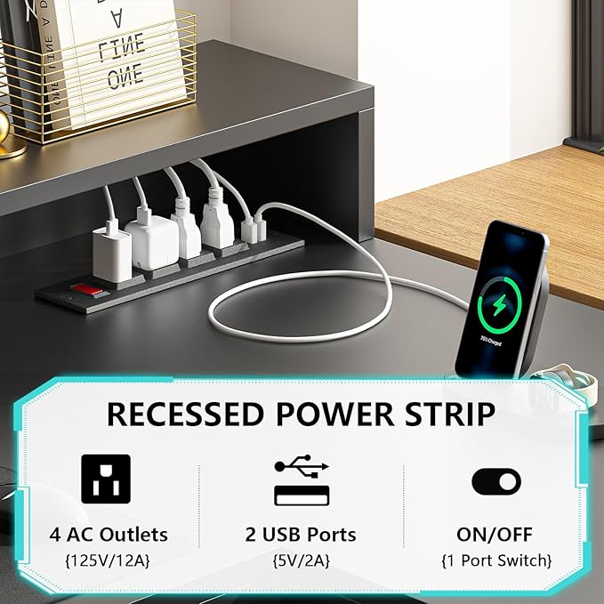 - [INTEGRATED CHARGING STATION]: Equipped with an integrated charging station, including 2 USB ports and 4 built-in AC outlets, this L-shaped desk can provide power support for your computer, tablet and phone and keeps your gaming equipment always powered up. Plus, the on/off switch can change your electronic device easily