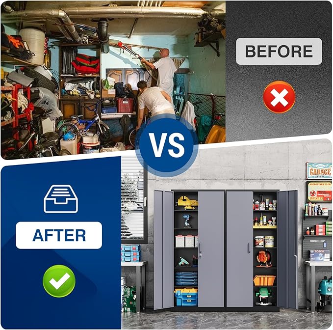 - Adjustable Shelf Height- The Metal Storage Cabinet has 5 adjustable partitions to accommodate items of different heights such as books, toys, kitchen supplies, toiletries, and garage tools. Suitable for garage, bathroom, kitchen, living room, study, office, as a storage cabinet. Use internal space more reasonably.