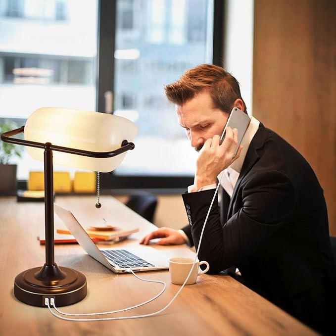 - Convenient Charging Ports: Designed with a built-in USB and Type C charging port on the base, our banker's desk lamp allows you to charge two electronic devices simultaneously. Whether it's your mobile phone, iPad, earphones, speakers, or e-books, this vintage lamp provides a convenient solution to the lack of sockets on the wall