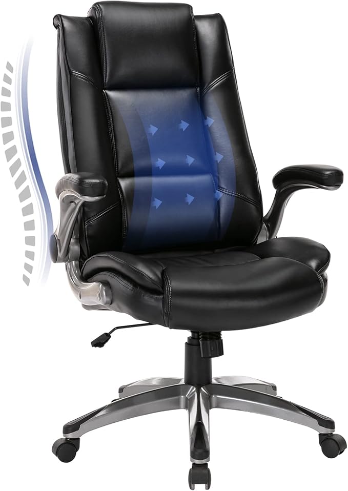 Leather Executive Office Chair - High Back Home Computer Desk Chair with Padded Flip-up Arms, Adjustable Tilt Lock, Swivel Rolling Ergonomic Chair for Adult Working Study, Black
