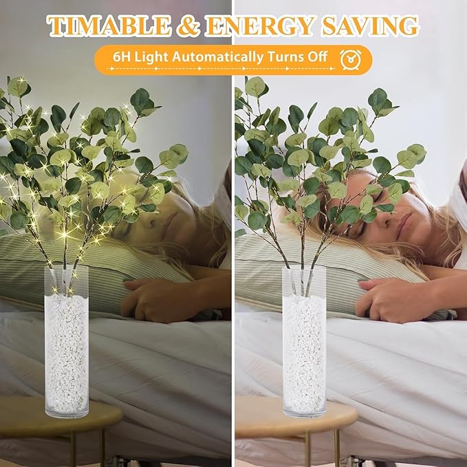 - šćLifelike Handmadeć Lighted eucalyptus branches is a handcrafted high-quality product with lifelike leaves and bark, you can even clearly see their texture, just like real eucalyptus branches. Its presence will add a splash of vibrant green and soft white light to your home, so that your room not only has the warmth of the home, but also the vitality of nature