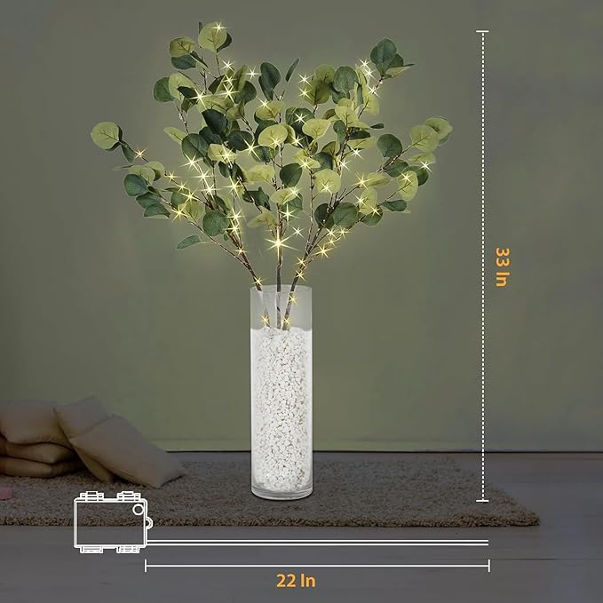 - šćYou can DIYćThe lighted eucalyptus branches are 33in high and contain 99 warm white LED lights. The texture of these eucalyptus-lighted branches is soft and sturdy, it is easy to bend into any shape. You are free to DIY into what you want, you can also put some Christmas, Easter, and other festive decorations on the lighted branches to decorate it