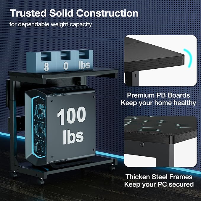 - Trusted Sturdy Construction: This pc tower stand's constructed with thicken steel frames, weight capacity tested in lab to withstand 80lbs(top) to 100lbs(bottom), keeps your valued computer secure in long-term use. Premium desktop's made with P2 PB boards [certified by EPA & CARB], anti-scracth, sturdy and easy to clean.