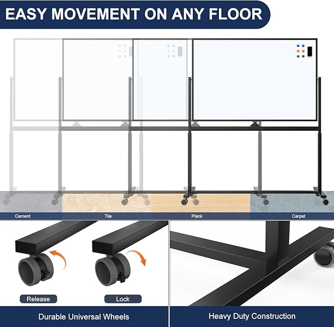 - EASILY ROLLING AND STURDY - With 4 easy rolling caster wheels, the large mobile dry erase board can be moved easily in any location you need. And each wheel has a locking system for keeping the mobile erase board secured in place when necessary. With wheels that can turn 360 degrees, it is much more simple to transport the whiteboard between rooms, whether on hard floors or carpet.