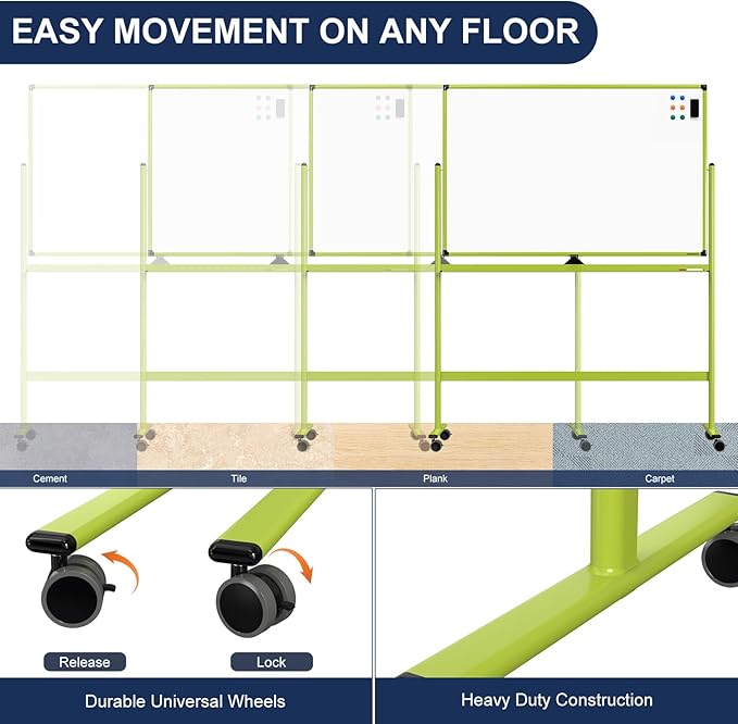 - EASILY ROLLING AND STURDY - With 4 easy rolling caster wheels, the large mobile dry erase board can be moved easily in any location you need. And each wheel has a locking system for keeping the mobile erase board secured in place when necessary. With wheels that can turn 360 degrees, it is much more simple to transport the whiteboard between rooms, whether on hard floors or carpet.