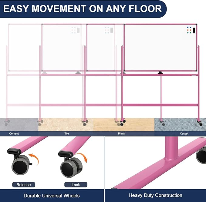 - EASILY ROLLING AND STURDY - With 4 easy rolling caster wheels, the large mobile dry erase board can be moved easily in any location you need. And each wheel has a locking system for keeping the mobile erase board secured in place when necessary. With wheels that can turn 360 degrees, it is much more simple to transport the whiteboard between rooms, whether on hard floors or carpet.