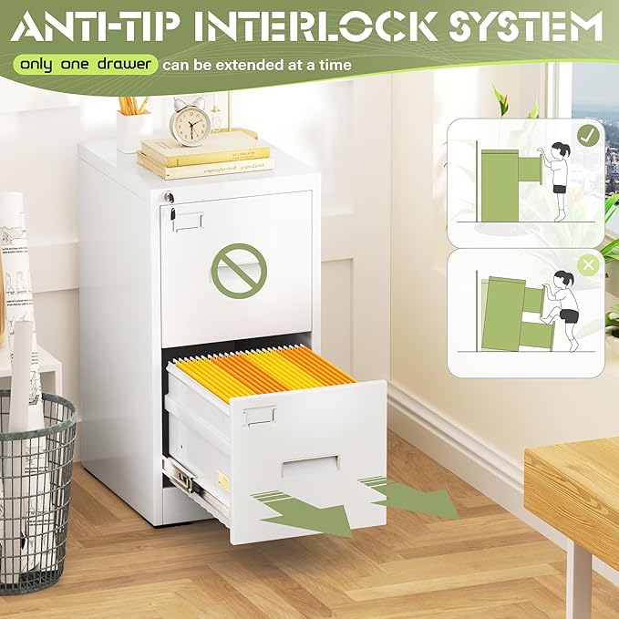 - 【High security】Two-drawer file cabinet with Lock is equipped with a built-in interlocking system to ensure drawer security. One locks with two keys ensures that your files are safe and easy to manage. The cabinet with drawers can be locked into two drawers at the same time with a lock, which is smooth and easy to operate.