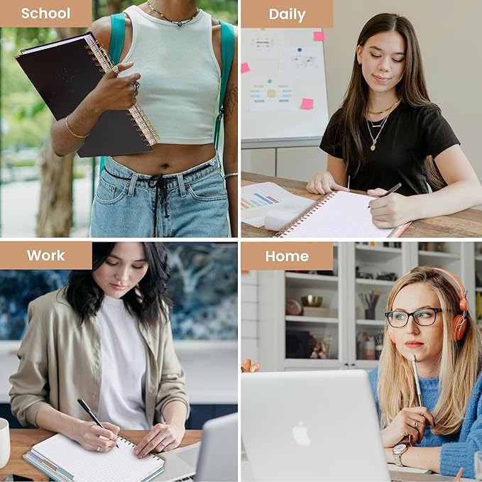 - 【HARDCOVER SPIRAL NOTEBOOK】 Never worry about ruined notes again with this spiral notebook's durable waterproof cardboard cover, protecting your 200 pages of college ruled, 100gsm paper from damage. With 6.1"x8.3" size, 4 golden metal corners, twin-spiral binding, and an information page to prevent loss, you'll have a reliable writing companion for important meetings and school work.