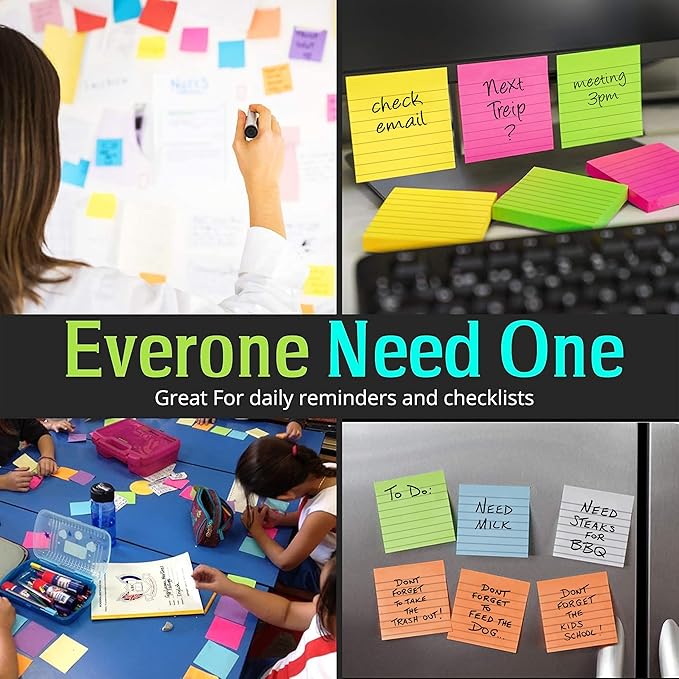 - Superior Super Adhesive: Designed for reliability, our notes feature an advanced super adhesive that sticks securely to most surfaces—monitors, desks, walls, and documents—and removes cleanly without leaving any sticky residue behind.