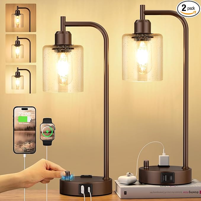 - MODERN DESIGN FOR INDUSTRY STYLE - Adopted thick cylinder glass shade, pairs with rust-proof matte brown finish iron, these rustic bedside lamps set of 2 perfectly combine a touch of vintage style with modern industry design, suitable for decorating anywhere in home and office, such as bedroom, living room, dorm, guest room, kids room, and also perfect gift choice for festivals, birthday and housewarming
