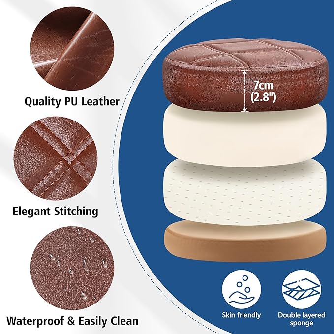 - Genuine Leather Seating: The round rolling stool seat cushion is wrapped in quality PU leather, waterproof, and oil-resistant. Filled with soft high-density memory foam, it provides a comfortable sitting experience for long periods and is easy to maintain and clean