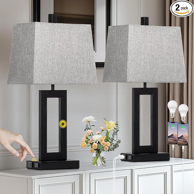 Touch Control Table Lamp Set of 2, Modern Black Bedside Lamps with USB C+A Ports & AC Outlet, 3 Way Dimmable Bedroom Lamps for Night Stands Bedroom Living Room,Nightstand Lamp